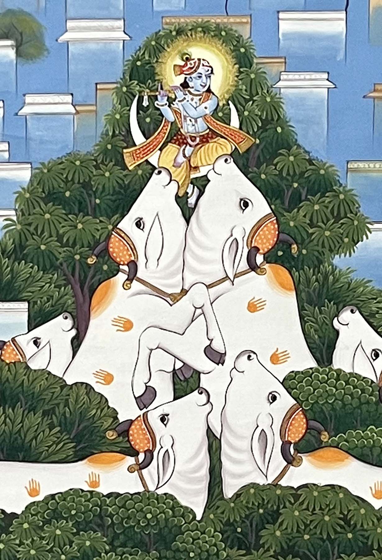 In this contemporary handmade painting, Krishna is depicted in a joyous and elevated state, surrounded by his cherished cows.