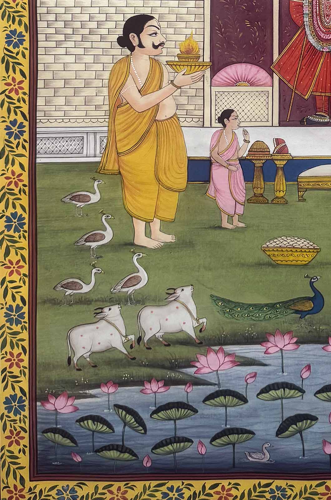 Step into the divine serenity of this handmade Pichwai painting, where Pujaris offer heartfelt prayers to Shrinathji, embraced by nature’s grace — with elegant peacocks, sacred cows, and a blooming lotus pond completing the sacred scene.